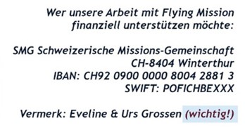 Nur, wenn im Vermerk unser Name steht, also „Eveline & Urs Grossen“, kann uns die Spende auch erreichen.